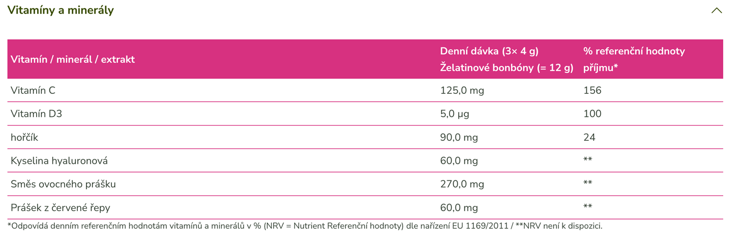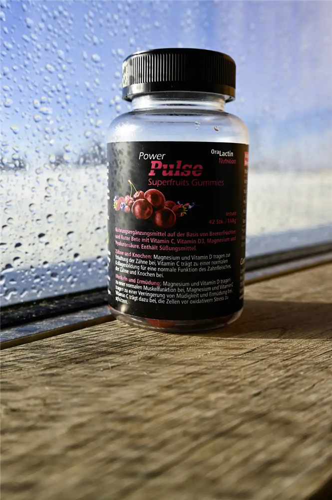 V několika gumových bonbonech kombinují to, na čem v každodenním životě záleží: pečlivě vybranou sílu superovoce a červené řepy, doplněnou vitamínem C, vitamínem D3, hořčíkem a kyselinou hyaluronovou. Receptura je navržena tak, aby podporovala zdraví ústní dutiny a mikrobiom a přispívala k každodenní pohodě. Vitamíny a minerály přispívají k normální funkci imunitního systému, svalů a regeneraci. Ovocná chuť, příjemně měkké, bez cukru a želatiny – ideální pro každého, kdo chce spojit požitek s uvědomělou výživou.