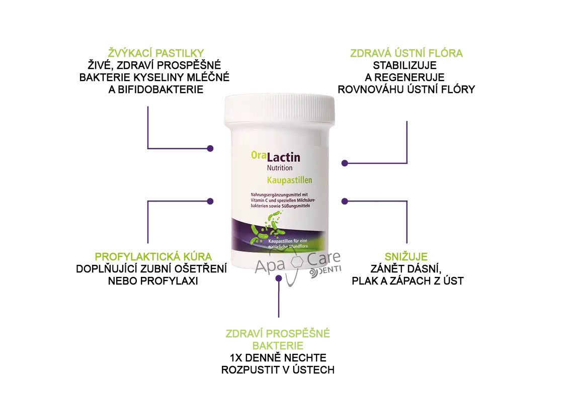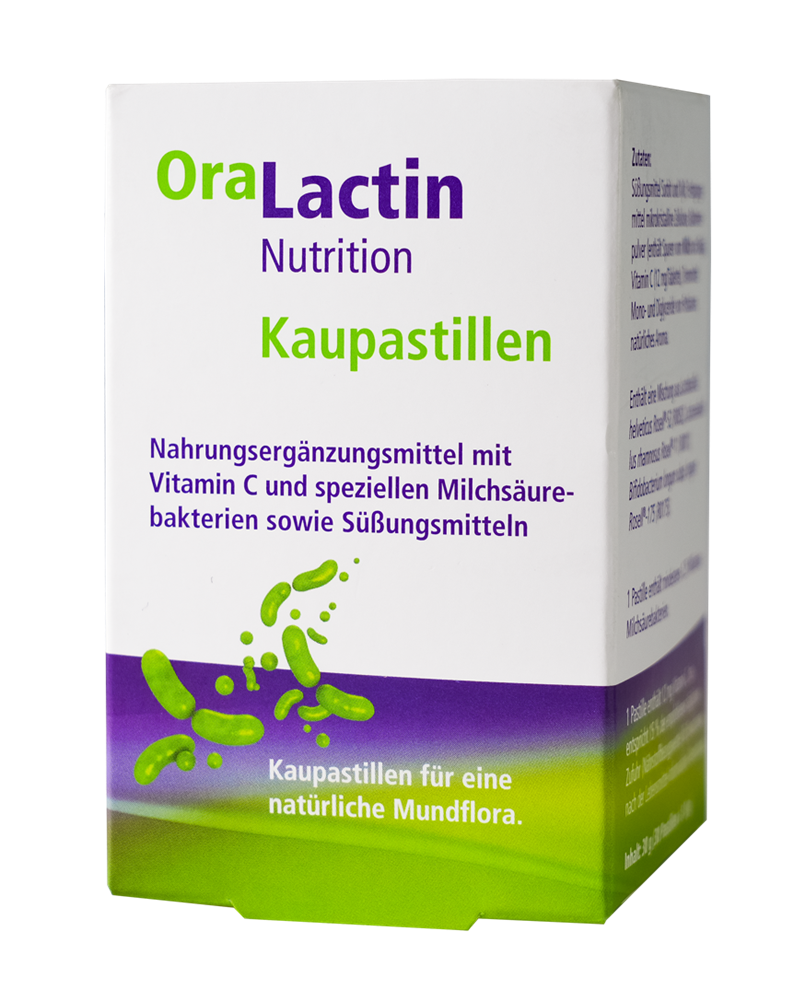 Žvýkací pastilky OraLactin pro každodenní péči o zuby a ústní dutinu. Chutné žvýkací pastilky svými vysoce kvalitními probiotickými složkami chrání před zubním kazem a parodontózou, obnovují rovnováhu zdravé ústní flóry a posilují přirozené obranné mechanismy v ústech. Žvýkací pastilky OraLactin chrání před zápachem z úst a podporují redukci plaku a zánětu dásní.