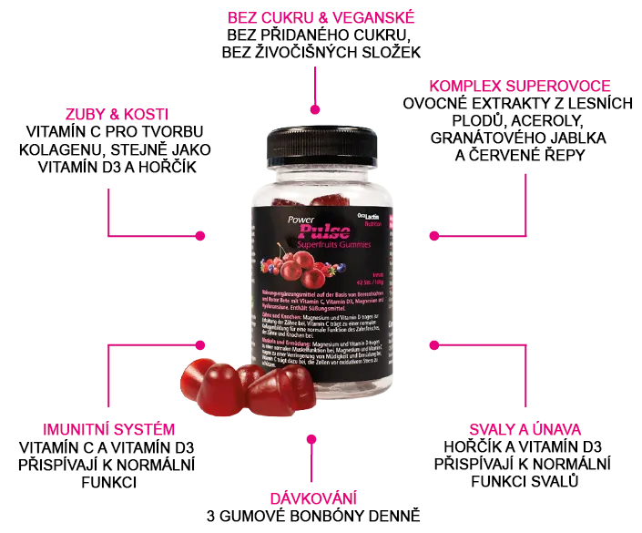 - FUNKČNÍ SUPEROVOCE Cílená kombinace superovoce a červené řepy – koncentrovaná v praktických gumových bonbonech