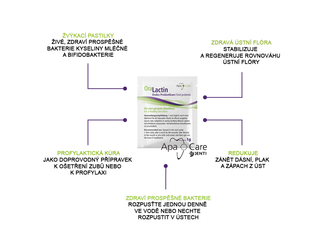OraLactin je vhodný pro všechny věkové kategorie (od 3 let) a podává se 1x denně po jídle po dobu 60 sec. Lze nasypat přímo do úst a nechat působit v dutině ústní, nebo rozmíchat v malém množství studené vody. Poté vyplivnout. Náhodné spolknutí nevyvolává žádné nežádoucí účinky. Každý sáček obsahuje minimálně 1 miliardu probiotických mikroorganismů ze tří různých kmenů, které mohou příznivě ovlivnit bakteriální osídlení zubů, dásní, jazyka a ústní sliznice. Účinek je klinicky testován.