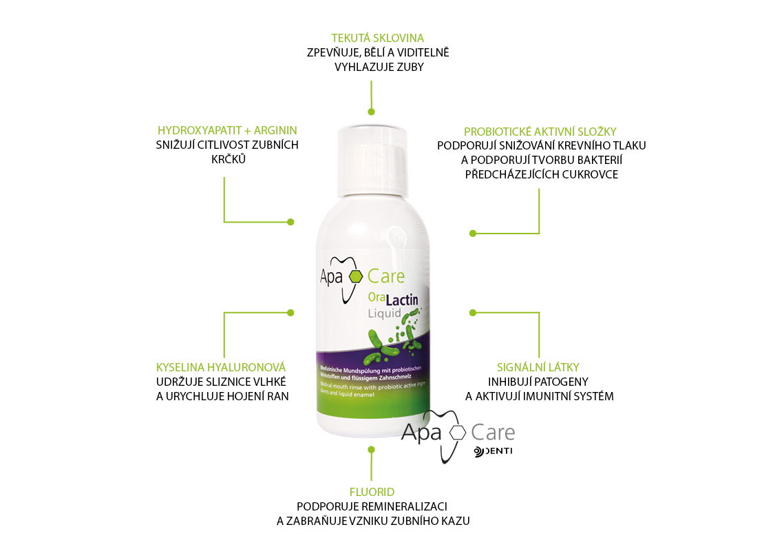 Ústní voda OraLactin obsahuje dusičnan draselný, který podporuje bakterie snižující dusičnany a regulující krevní tlak. Navíc L-arginin na ochranu před přecitlivělostí. Obsažená kyselina hyaluronová podporuje regulaci vlhkosti ústní sliznice, zmírňuje záněty a urychluje hojení intraorálních ran.